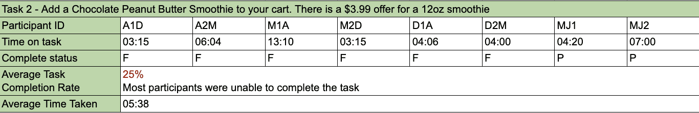 Participants who navigated to the item page, encountered issues with identifying the corresponding fluid ounce due to the inconsistency of sizing listed (snack, regular, large when ordering vs. 12oz smoothie on offer).
