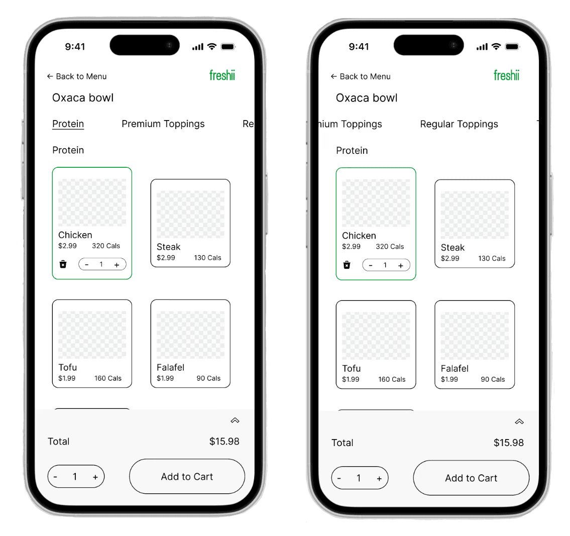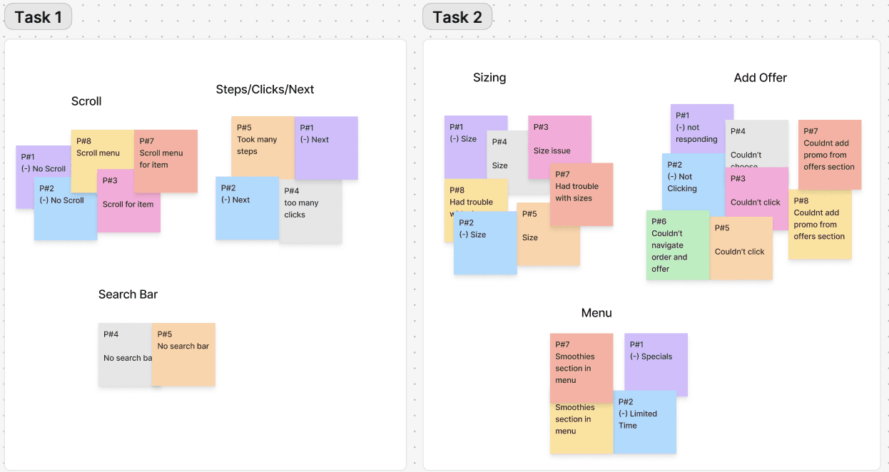During the first task, a common friction point was the inability to scroll through the toppings selection. Most participants expressed frustration as they were forced to click "Next" for each category, violating the heuristics of flexibility and efficiency of use. This flow went against the participant's expectation